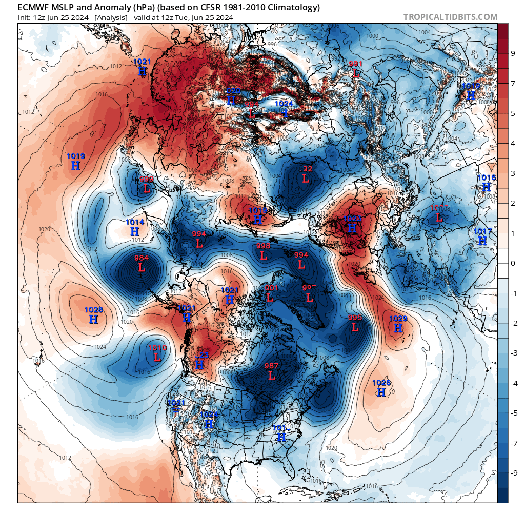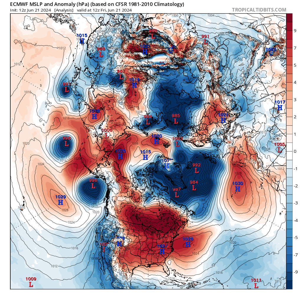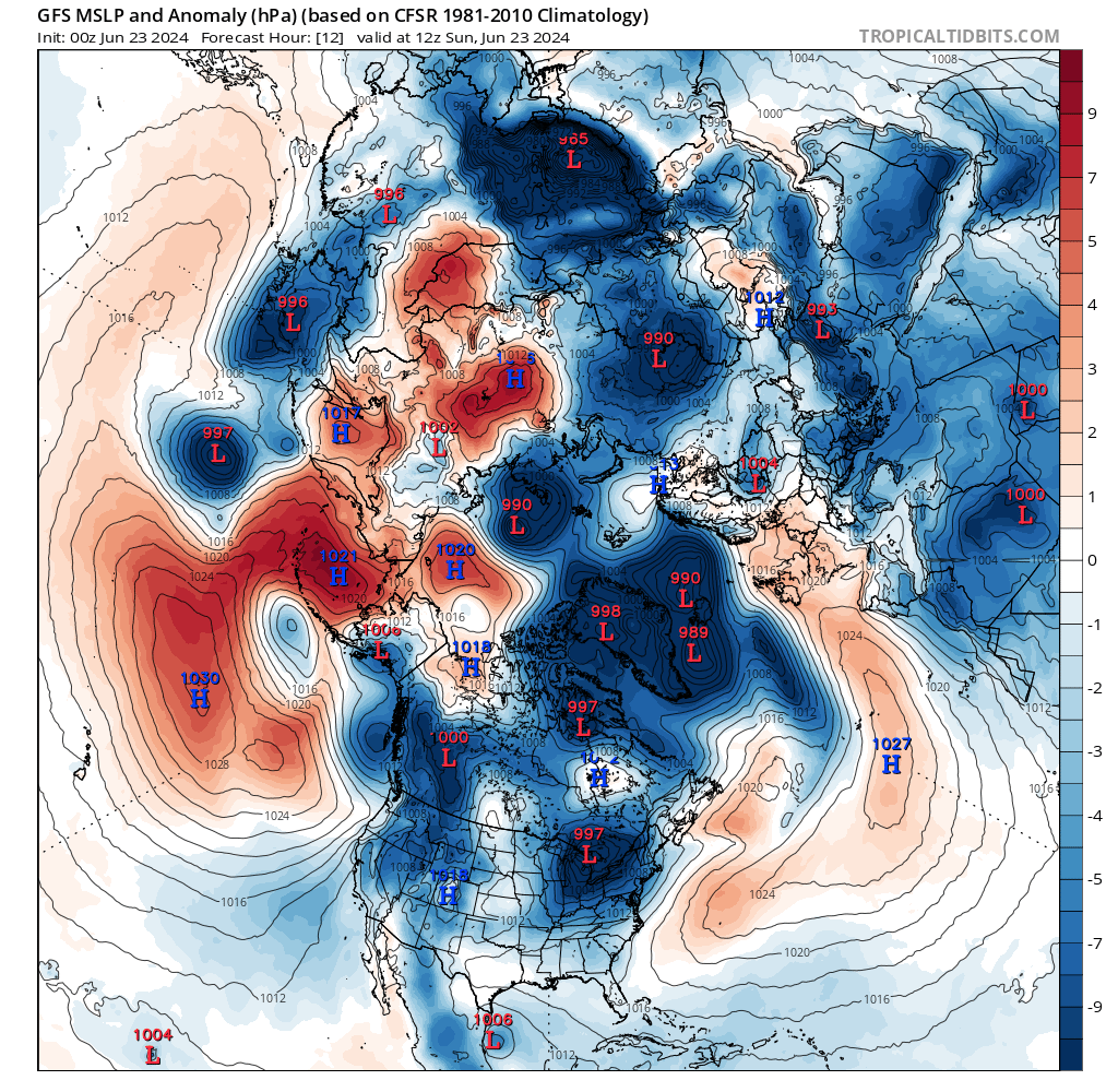 . Basses pressions USA sauf sud-ouest. Basses pressions Canada sauf extrême nord-ouest. Basses pressions Alaska. Hauts géopotentiels Alaska. Bas géopotentiels Canada. Hauts géopotentiels USA sauf façade est.