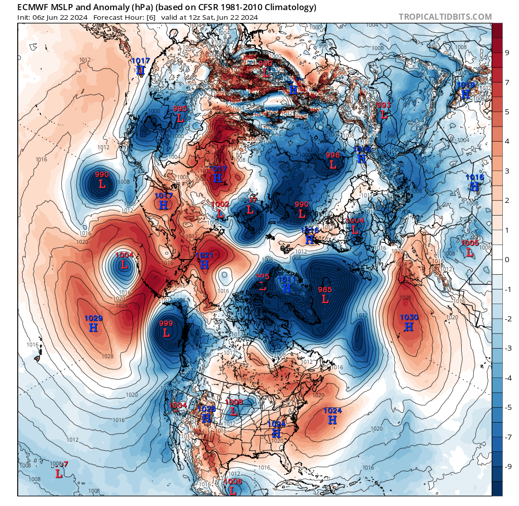 . Hautes pressions USA sauf façade ouest. Hautes pressions Canada sauf nord/nord-est et extrême ouest. Basses pressions Alaska. Hauts géopotentiels Alaska. Hauts géopotentiels Canada sauf nord. Hauts géopotentiels USA.