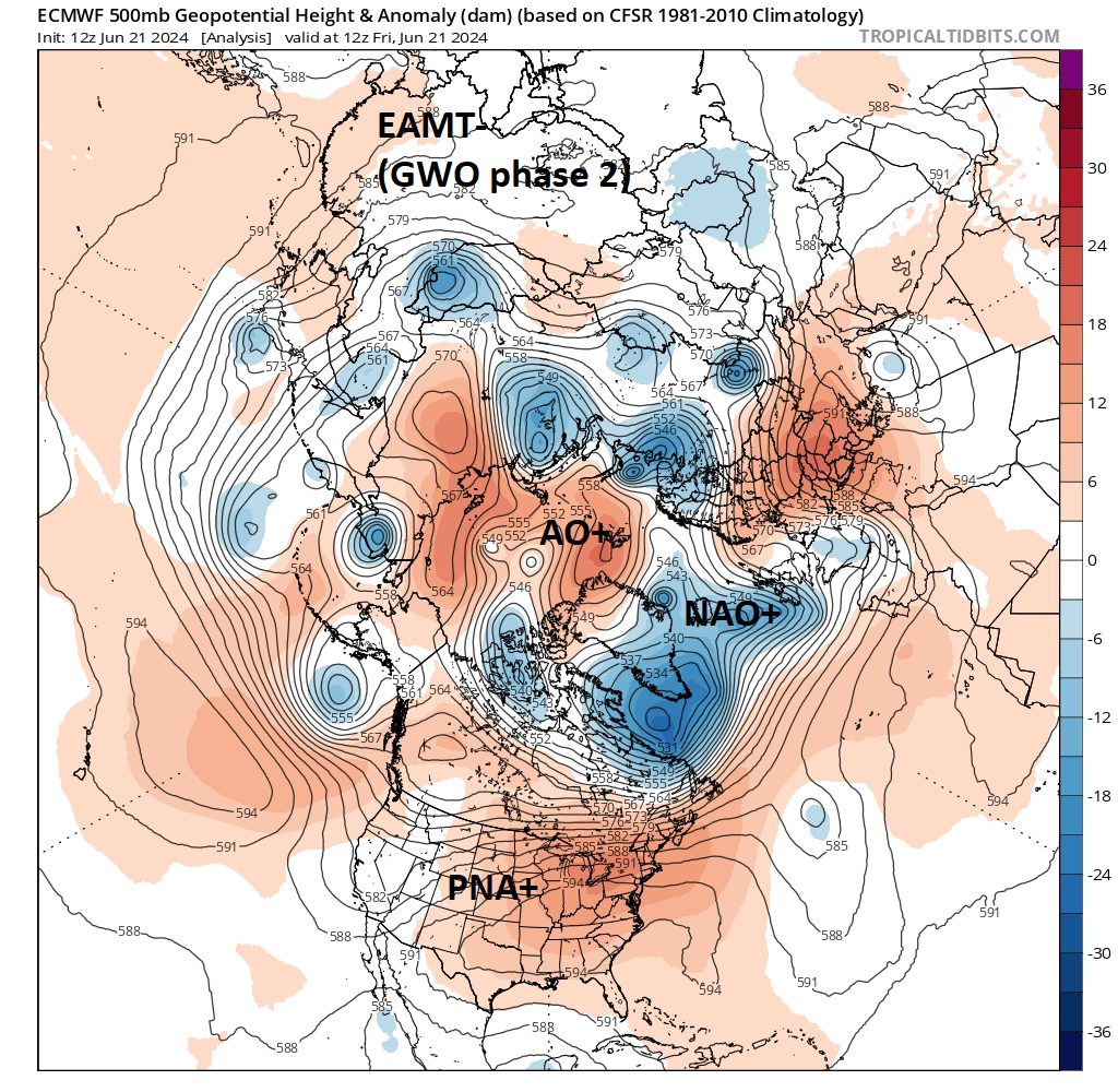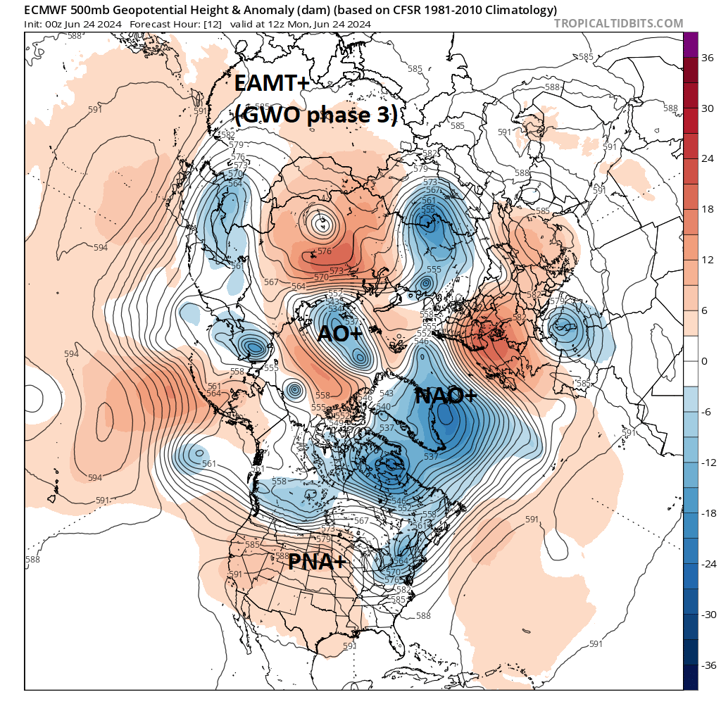 . EAMT+ GWO phase 3 (AAM-) : favorise un afflux de hauts géopotentiels sur le continent américain et une PNA+