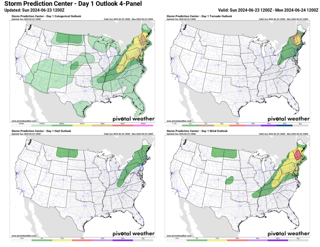Orages parfois violents à prévoir dans le nord-est des USA avec un risque de tornades évalué à 10% par le SPC pour le New Hampshire, Vermont et Massachussets.
