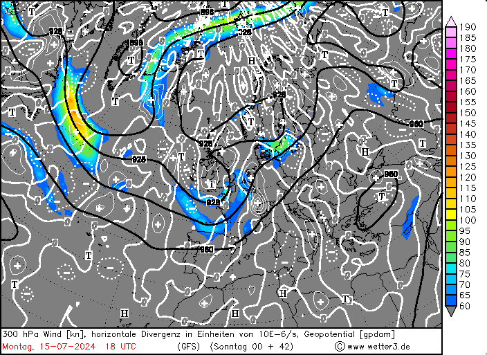 L’avancée de ce talweg avec son froid froid bien organisé, se heurtera à l’avant à de l’air chaud. Dans le secteur chaud à l’avant immédiat du front froid, on peut s’attendre au développement d’orages parfois forts avec éventuellement de fortes pluies passagères, une forte activité électrique, de violentes rafales de vent autour de 100 km/h et des chutes de grêle. On notera un dynamisme important en altitude avec une forte divergence simulée en fin de journée de lundi ce qui augure d’un risque d’orages forts surtout du Massif Central au nord-est.