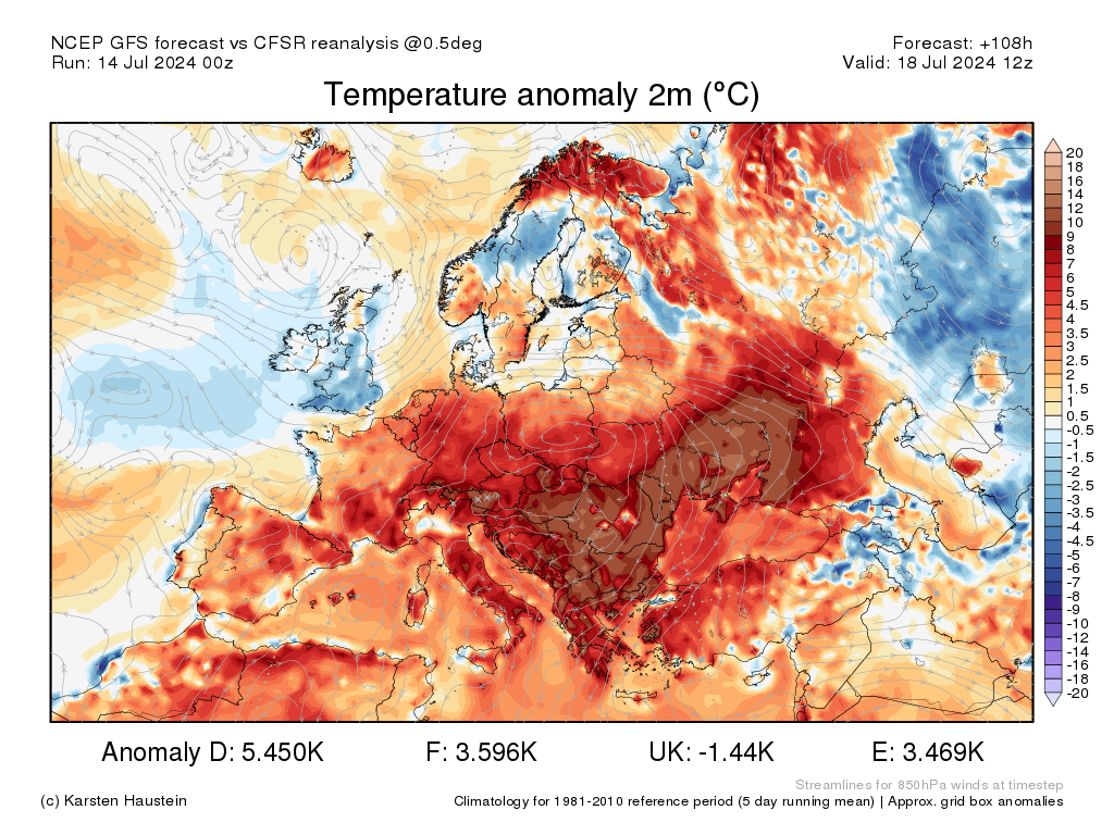 A partir de jeudi et jusqu’à la fin du week-end mais possiblement encore plus loin en échéance, le pourtour méditerranéen peut s’attendre à de très fortes chaleurs avec quotidiennement 35°C et +. La barre des 20°C à 850 hPa sera souvent atteinte et dépassée.