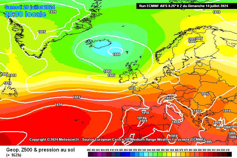 Le modèle européen ne suit pas l’américain avec une circulation zonale mais un courant jet qui s’abaisse en latitude, dans ce cas là un temps bien mitigé s’installerait au nord de la Loire pour le week-end avec éventuellement quelques pluies. Pas d’orages dans cette configuration.