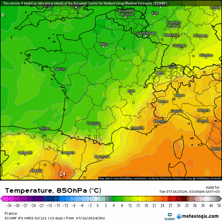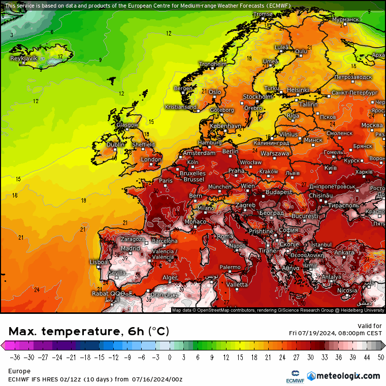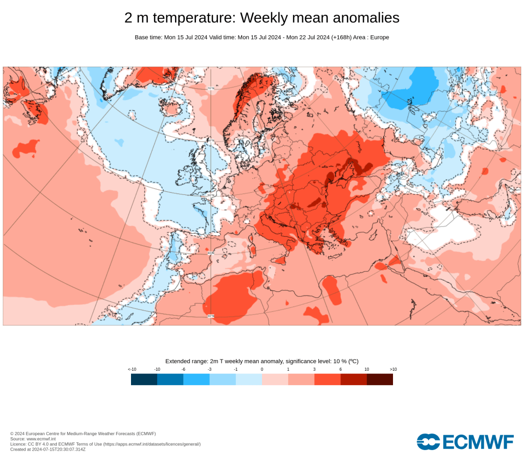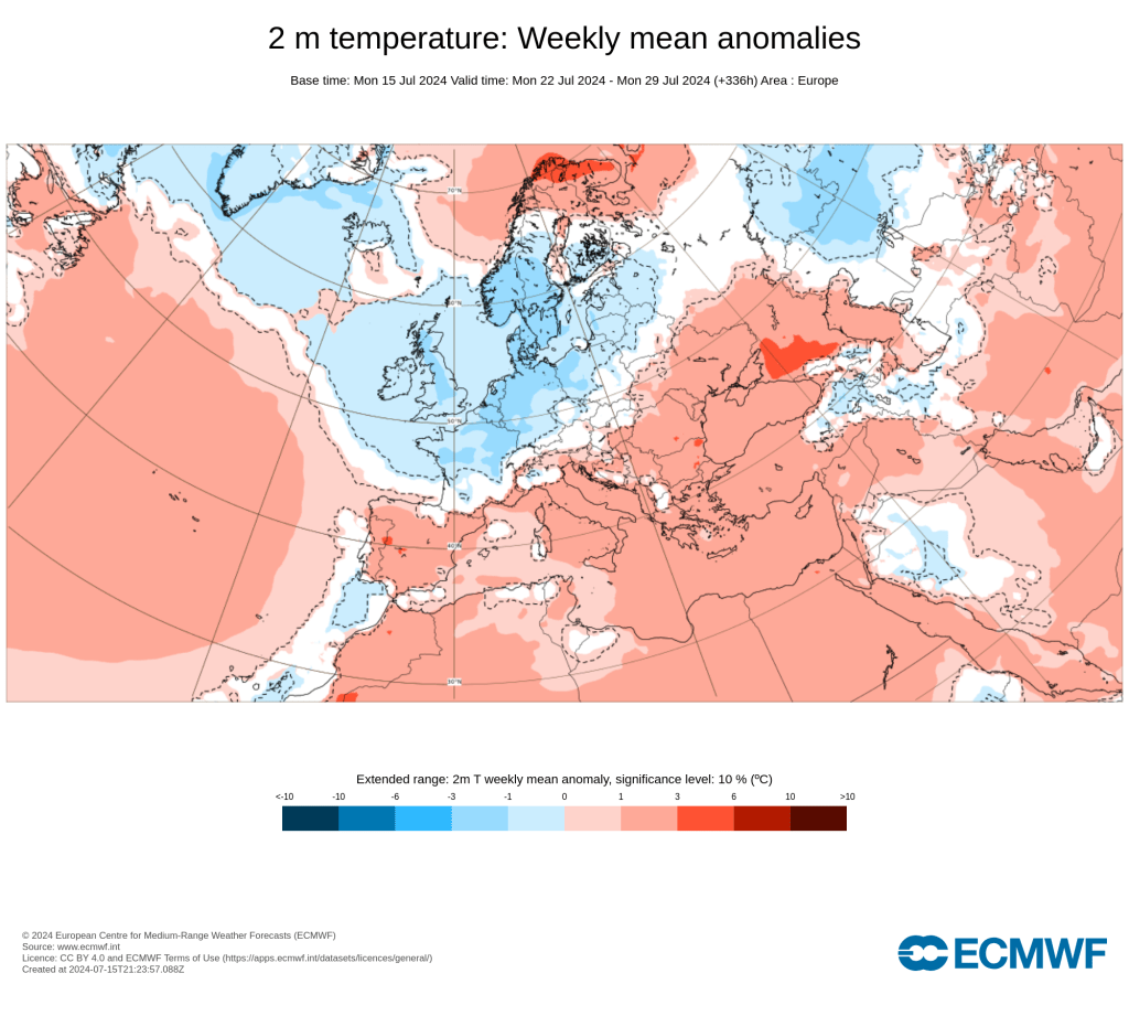 L’influence océanique devrait l’emporter la semaine prochaine en se diffusant sur à peu près toute l’Europe. Les températures pourraient baisser un peu partout tout en gardant des niveaux estivaux quasiment partout sauf dans l’Europe du nord. Le sud de l’Espagne après un court rafraichissement en fin de week-end, pourrait retrouver des températures très élevées la semaine prochaine avec des températures autour de 40 à 42°C.