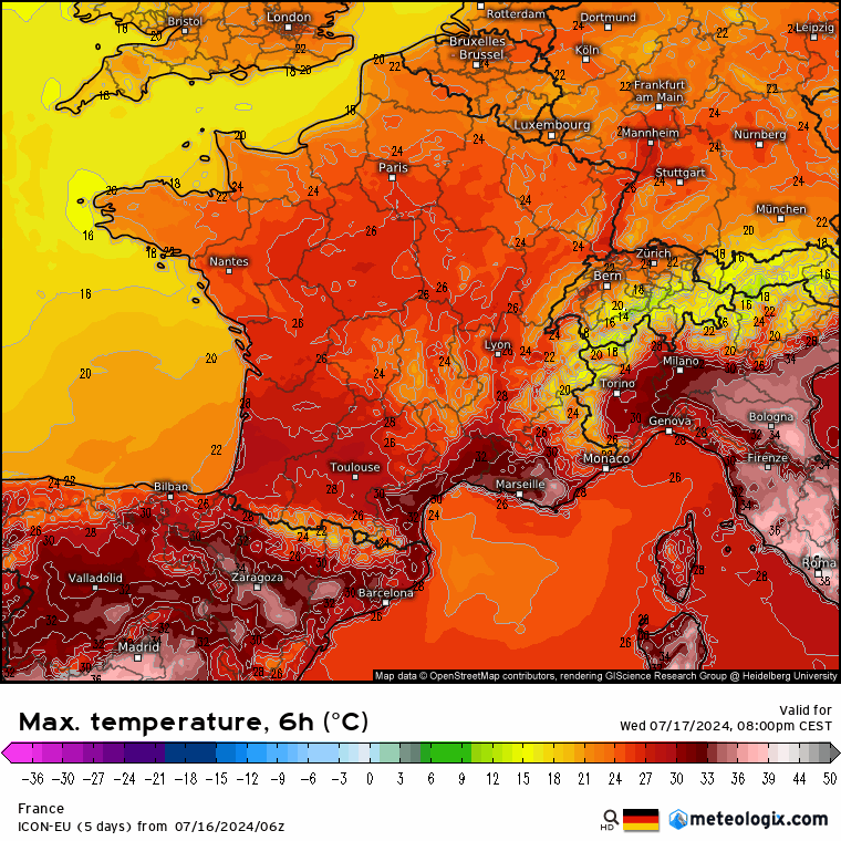 Précision : Les températures autour de 40°C attendues dans le sud-est entre jeudi et samedi notamment, sont tout sauf normales et correspondent à une anomalie considérable. La hausse de la fréquence de ce type d’épisode notamment depuis 2015, ne doit pas faire oublier que ce n’est pas la normalité de vivre de telle températures même en milieu méditerranéen. La végétation et certaines cultures ainsi que la faune, peuvent en souffrir.