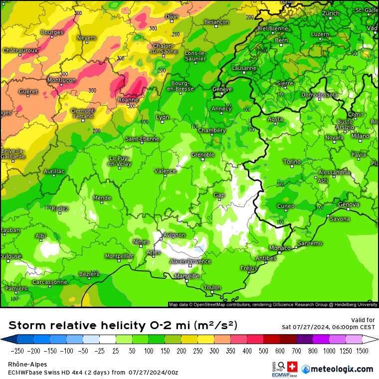 De bons noyaux d’hélicité (SRH 0-3 km) circuleront en cours d’après-midi du Puy de Dôme au nord de la Loire, l’Allier se décalant ensuite vers la Saône et Loire et plus au nord-est. Ce paramètre est très favorable à la mise en place de cellules orageuses supercellulaires avec une certaine durée de vie.