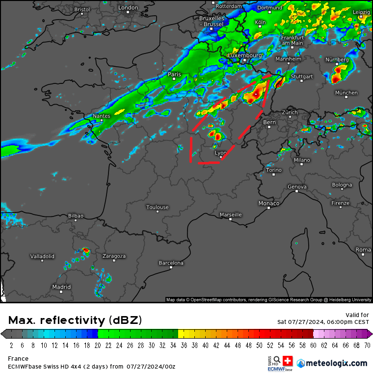 Des orages souvent supercellulaires se formeront en cours d’après-midi sur le nord de l’Auvergne et l’ouest de Rhône-Alpes se décalant vers l’est/nord-est pour ensuite atteindre le nord-est notamment le secteur des Vosges.
