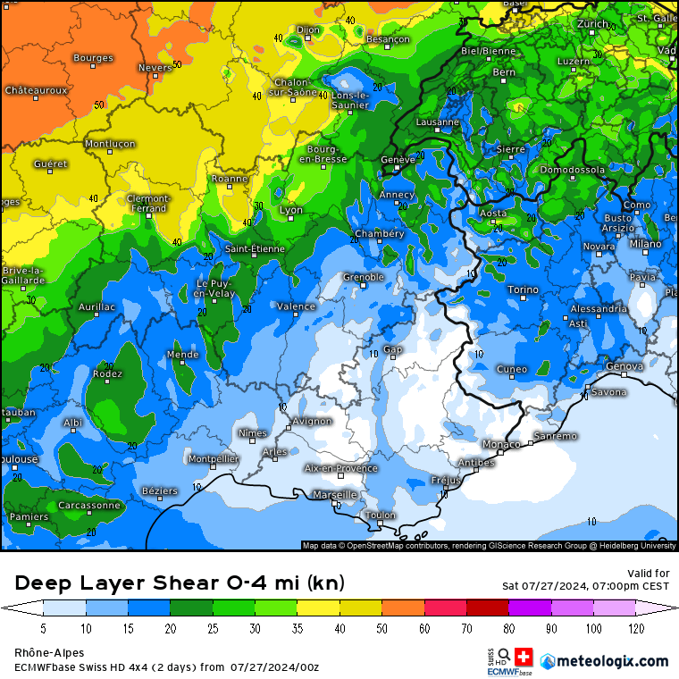 Cisaillements profonds modélisés autour de 20 m/s ce qui est une bonne valeur pour que des supercellules s’érigent avec également l’aide des petits reliefs du nord du Massif Central. On notera des cisaillements aussi bien en vitesse que directionnels ce qui favorise ce type de foyers orageux supercellulaires.