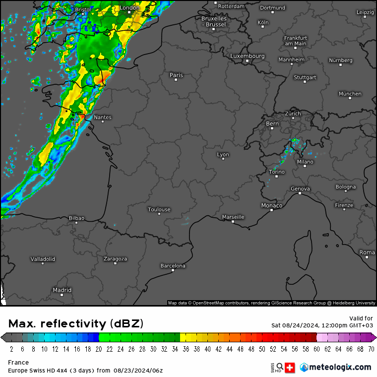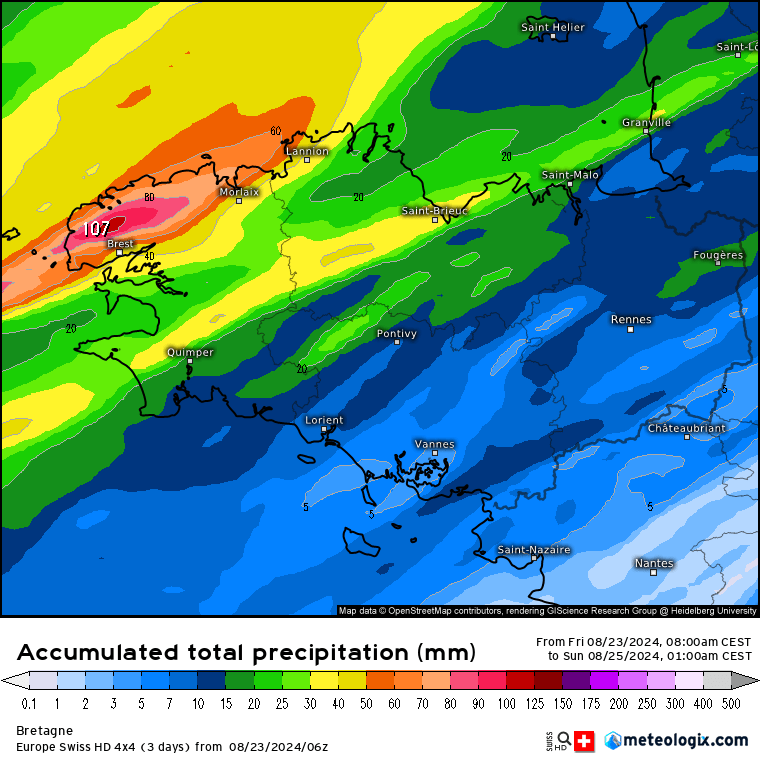 Le modèle suisse n’y va pas avec le dos de la cuillère concernant de possibles cumuls de pluie sur le nord Bretagne. Des cumuls de plus de 50 mm paraissent probables du nord Bretagne à la Cotentin. Les pointes à plus de 100 mm paraissent un peu extrêmes cependant.