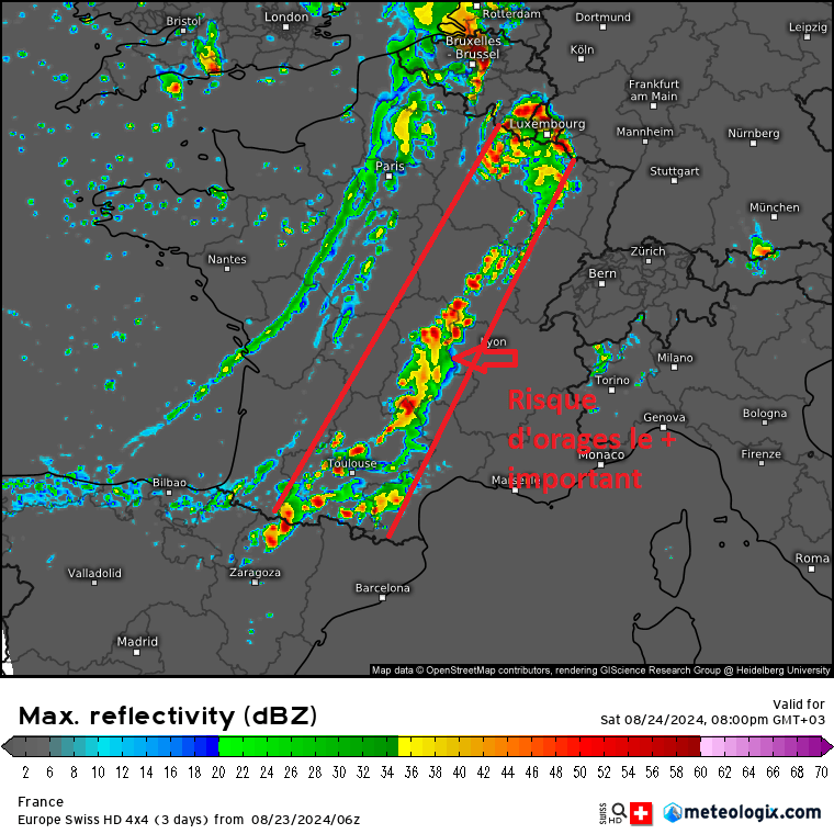 Du sud-ouest au nord-est, ces orages parfois forts à caractère multicellulaire le plus souvent (localement des supercellules ne sont pas à exclure) seront susceptibles de donner des dégâts localement.