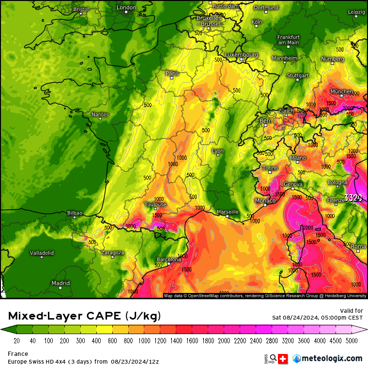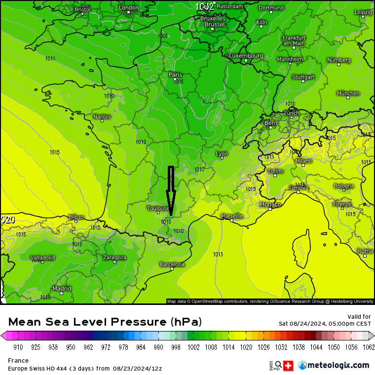 Talweg en basses couches bien dessiné descendant jusqu’à l’Occitanie qui favorisera la convergence des vents en basses couches, les vents d’ouest venant de l’Atlantique se heurtant à l’avant à des vents de sud à sud-est. Pour rappel, la convergence favorise l’élévation de l’air chaud en altitude avec condensation amenant à la formation des cumulus et cumulonimbus.