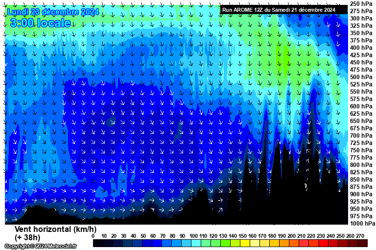 Sur les coupes du modèle Arome, on voit sans mal aux vitesses verticales les orographies se mettant en place sur les versants nord-ouest de chaque relief, de gauche à droite, des Vosges aux Alpes en passant par le Jura. Orographie restant marqué lundi avec un pivotement du flux au nord/nord-ouest, les versants exposés nord-ouest puis nord seront copieusement enneigés avec des masses nuageuses qui resteront bloqués. Cela favorisera aussi les pieds de reliefs exposés nord-ouest puis nord/nord-ouest d’être enneigés dès la basse altitude notamment côté Alpes du nord
