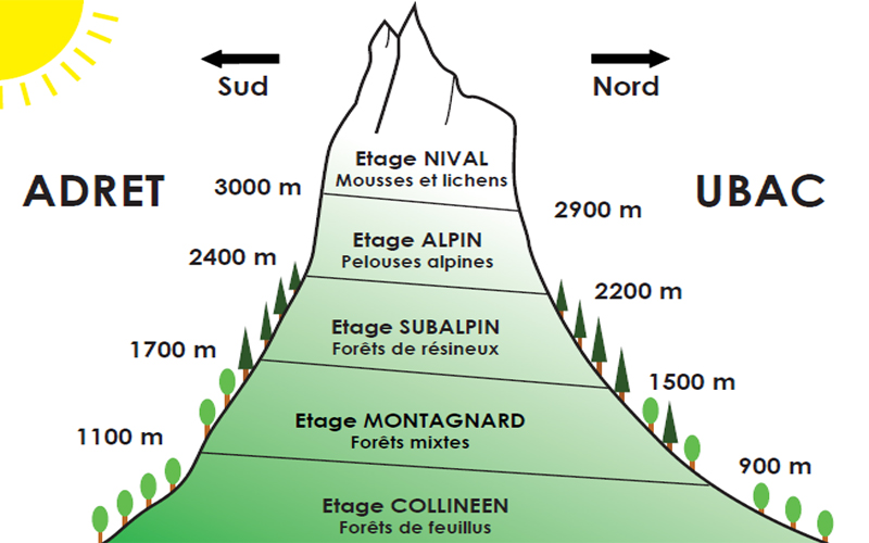 Par journée ensoleillée, un adret alpestre peut recevoir de 8 à 10 fois plus de chaleur qu’un ubac de même pente, facteur qui conditionne la répartition des espèces : essences résistant à la sécheresse en adret (pin sylvestre, pin à crochets), essences recherchant l’humidité en ubac (hêtre, sapin, épicéa, pin cembro et mélèze[4]). (Wikipédia)